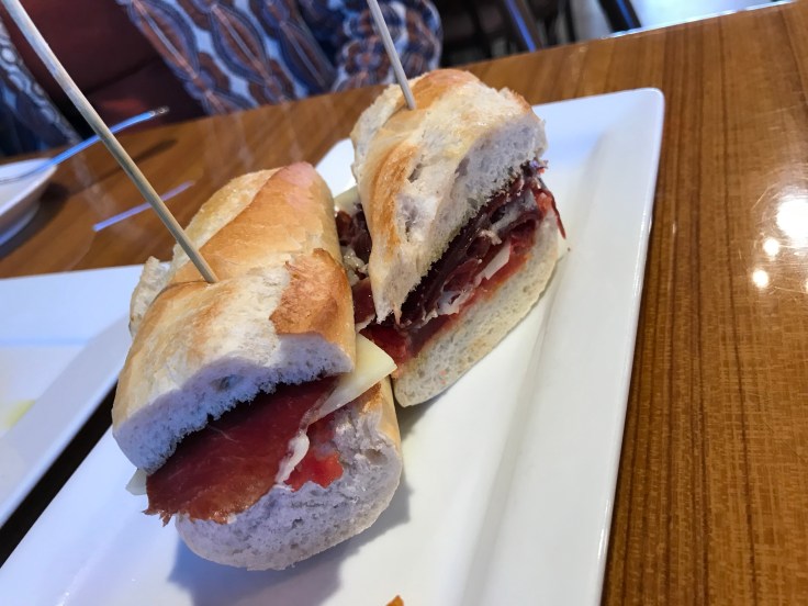 The sandwich was perfect – slightly toasted bread, good amount of jamon iberico(it’s similar to prosciutto but a bit saltier and drier), good ratio of cheese and tomato as well. We got the sweet potato chips instead of the side salad and let me tell you…. these were theeee best sweet potato chips I’ve ever had. They slice them super thin and they end up with the perfect crisp.
